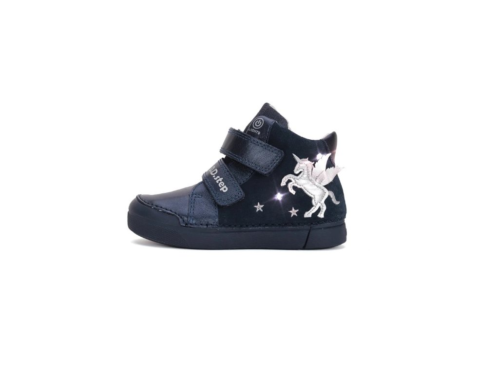 D.D. STEP detské dievčenské prechodné kožené s LED svetlom topánky Royal Blue Unicorn,*068