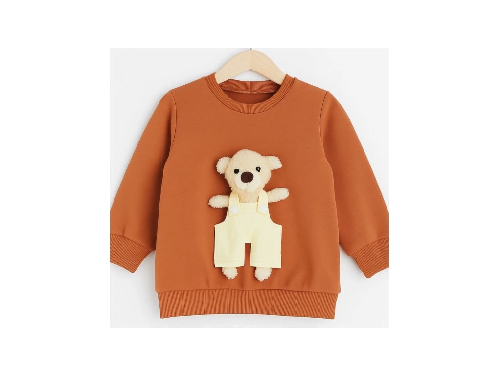• Detská unisex bavlnená mikina v koňakovej farbe s odnímateľným plyšákom.